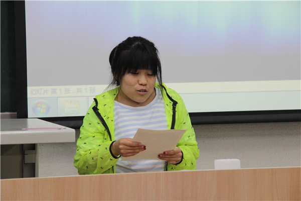 本次主题班会由工商一班班长李璐璐同学主持,首先上台进行汇报交流的是工商二班班长金子捷同学,他用幽默调侃的方式说出了如今本专业在学习和生活中出现的问题,并且希望同学们能够集体克服困难,在学习、生活上更上一个台阶儿。