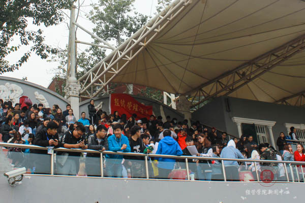 运动场看台的坐席很凉但同学们的心情却十分火热,同学们放下了平时不离手的手机享受这场运动盛宴,为赛场上的同学高呼加油。如果说赛场上的经管运动员们是奔驰在赛场上的跑车,那台上的经管观众们就是他们的加油站,给予比赛中虽然成绩落后但永不放弃的运动员以最热烈的掌声。往往冲刺前的几秒观众会全员起立,屏住呼吸,等第一个人冲线后全场再爆发出雷鸣般的掌声。
