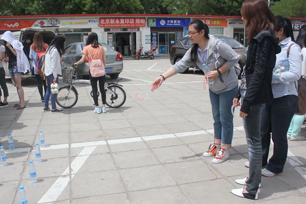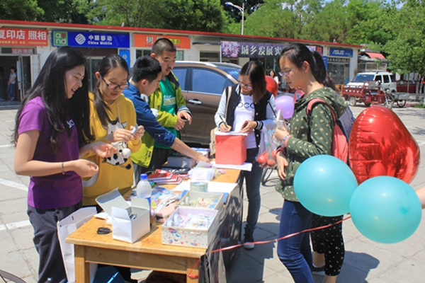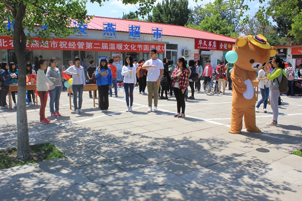 晴朗的天空下,外联部的干事们一直在为活动忙碌着。在超市门前的空地上,外联部分别设置了套圈、夹豆子等游戏,参与的同学们可以用游戏来换取积分,换得奖品。这些小游戏让参与的同学玩的不亦乐乎,纷纷参与到活动中。外展的最前面,是手语社的同学们用手语表演着“感恩的心”,伴着音乐的手语表演,引得过路的同学纷纷驻足观看。手工社的社员们手上也忙个不停,用心教着参与的同学编制着手工作品。