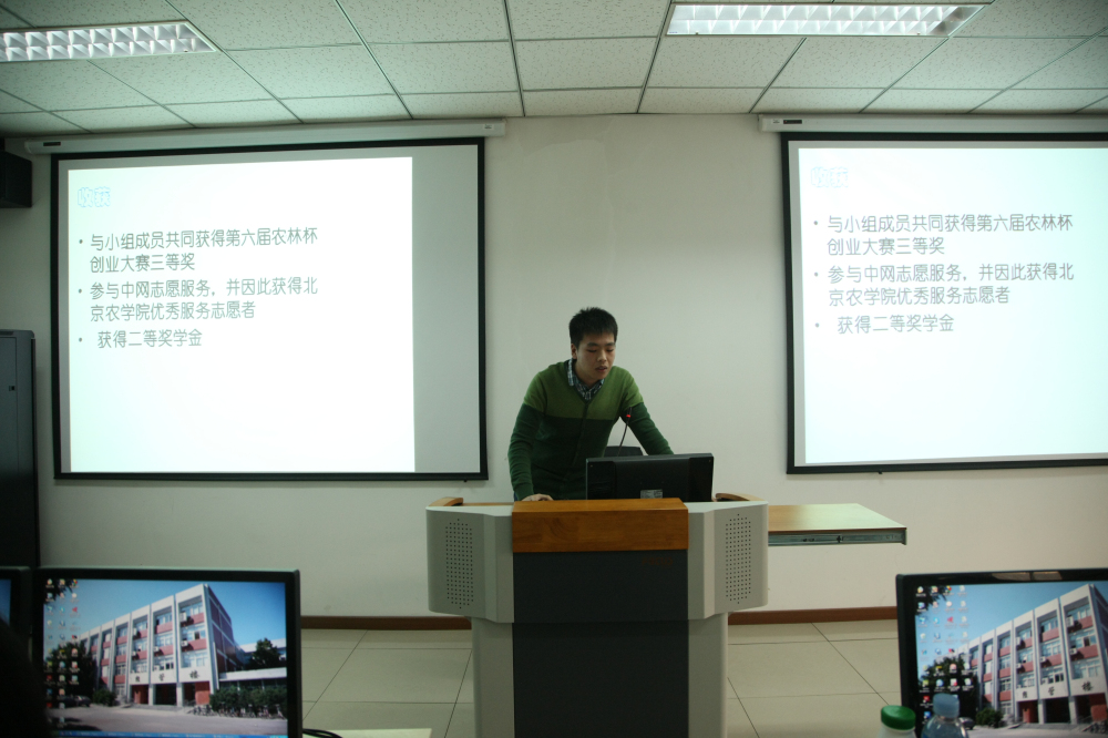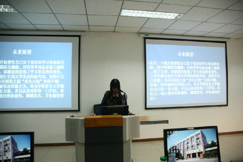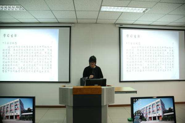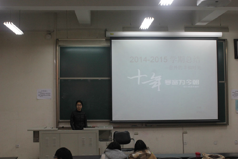 接下来同学们采用PPT的形式上台进行学期总结汇报。在学习方面同学们分析了各自在课堂出勤、考前准备等方面的进步与不足,制定下学期的学习计划;在社团活动方面,分析了各自在员工会、团委、社团等各方面的成就与收获;在生活方面,通过照片展示出同学们之间的友情。