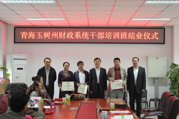 蒋林树副处长宣读《关于授予青海玉树州财政系统干部北京培训班学员结业证书决定》。华玉武主任宣读《关于表彰青海玉树州财政系统干部北京培训班优秀学员的决定》。在热烈的掌声之中,各位领导为全体学员颁发结业证书,为优秀学员颁发证书及纪念品。