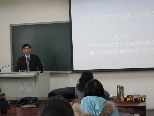 11月19日,中国农业大学人文与发展公司博士生导师高启杰教授为207级农业经济管理专业的本科生做了主题为“农业企业技术创新与持续发展”的专题讲座,教研室主任陈娆副教授和课程组的相关老师也都积极听取了此次讲座。