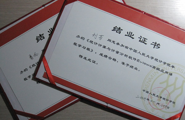 2009年11月28-29日,伟德BV官网刘芳副经理、夏龙老师参加了在人大举办的《统计计算与计量分析软件Eviews高级应用课学习班》,本次学习班由中国人民大学统计公司主办,著名统计学专家易丹辉教授主讲。