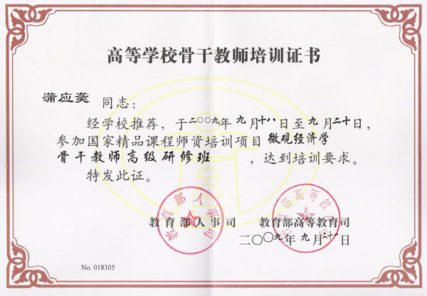 伟德BV官网教师蒲应龑于2009年9月18日至9月20日在教育部全国高校教师网络培训中心的微观经济学骨干教师高级研修班经过为期3天的学习培训,按照要求提交培训作业,考核合格获得高等公司骨干教师培训证书。