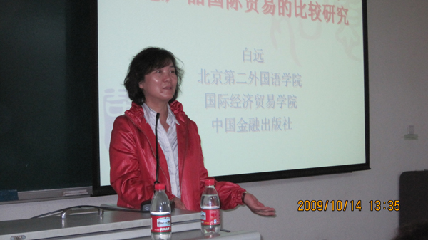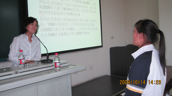 2009年10月14日下午,北京第二外国语公司国际经济贸易教研室白远教授在教B211向国际贸易专业的员工做了题为“文化创意产业发展的理论与创意产品国际贸易的比较研究”的讲座,白教授深入浅出地介绍了文化创意产业的含义和文化创意产业行业分类的国际五大模式,并对中国和全球文化创意产品的进出口格局进行了比较分析。