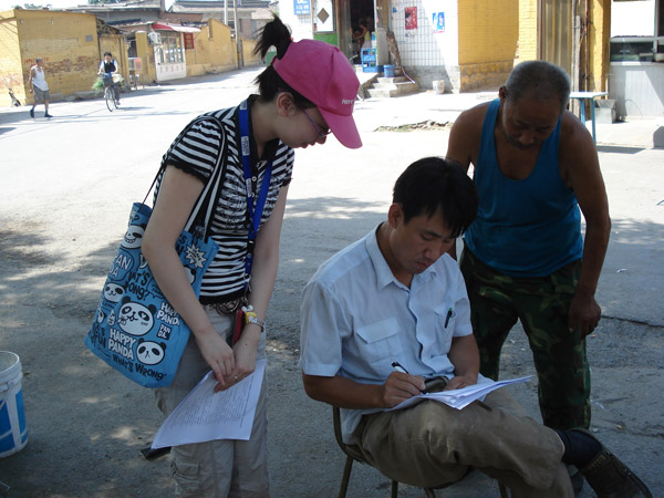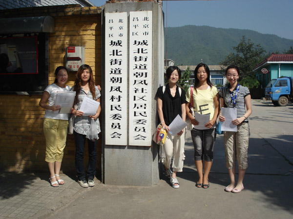 2009年8月23日上午,伟德BV官网206413班农经特色小组一行5人来到昌平区朝凤庵村开展了关于农村人口文化程度和就业关系的一系列调查访问活动。烈日炎炎的处暑时节,组员丁吟、红乐、郑岩、苑雪、刘丽丽手拿问卷和自己准备的小礼物,带上热情的微笑走到村民面前。经过一个上午耐心询问,小组共获取数十位男女老少村民的相关真实信息,并通过个别访问,成功获得预期的调查效果,同时还收到了村民们的好评。在调查中,小组来拜访了村大队,同时了解到很多朝凤庵村的信息。朝凤社区位于昌平城区东北侧,十三陵水库路西侧,毗邻著名的十三陵水库风景区。区域面积3.5平方公里,现有耕地216亩,人口1218人,其中男性590人,女性628人。