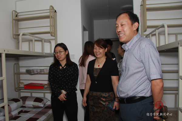 首先,院领导来到女生公寓7号楼,一进宿舍,院领导亲切热情的和新生及家长打招呼,并叮嘱新生不要相信上门推销的人,新生缴费以班助和老师的通知为准,不要轻易相信他人。