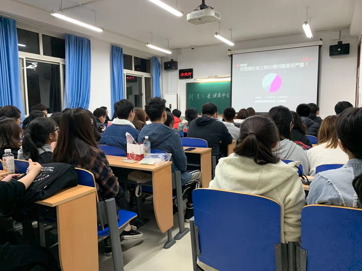 班会以一段舒缓的轻音乐开始,带领同学们调整呼吸,放松身心。随后以心理情景剧和PPT介绍带大家进入主题班会,通过心理情景剧,学会了同学之间应友好相处、互相帮忙,如何缓解心理压力以及找教师或同学帮忙来消除、而不是做出其他损害他人利益的事来消除压力。随后的PPT中介绍了近年来员工因心理问题走上极端的人数扇形统计图,使同学们充分地认识到心理健康的重要性。第二个环节是观看心理健康知识讲座的微视频,提醒同学们要不断增强心理调适能力和社会生活的适应能力,处理好环境适应、自我管理、学习成才、人际交往、交友恋爱、求职择业、人格发展和情绪调节等方面的困惑。最后,同学们围绕心理困惑进行了探讨、交流。