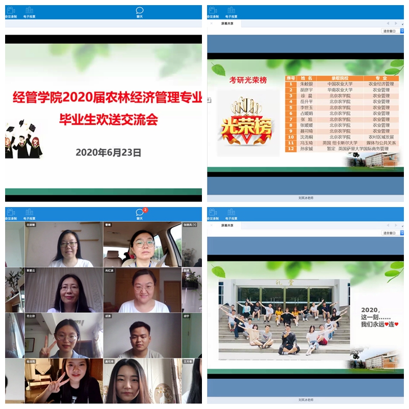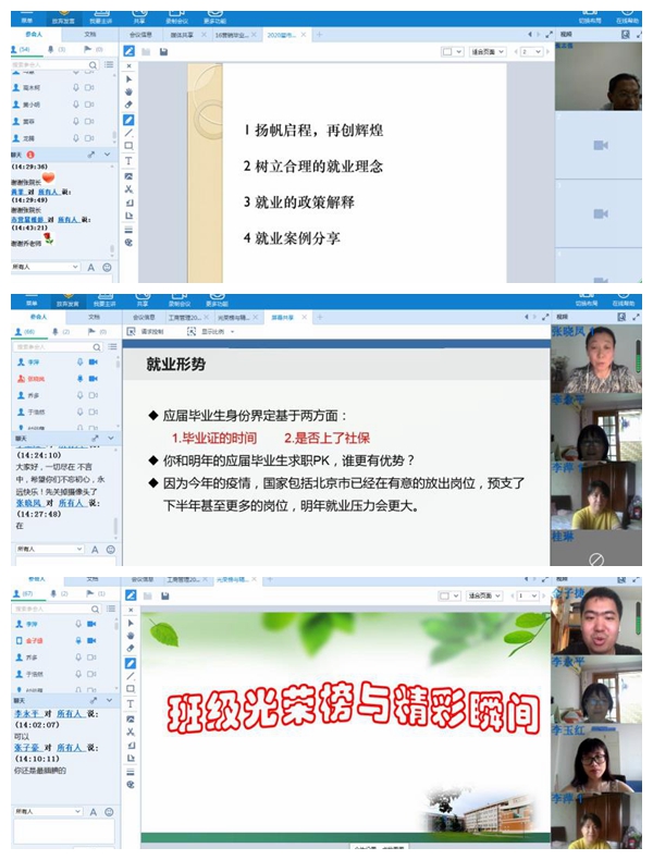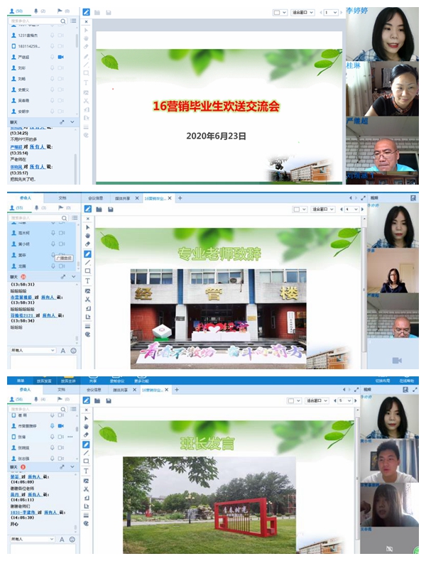 5月27日,对于2020届毕业生来说最开心的莫过于公司召开员工返校复课工作部署会,大家终于可以回到梦寐以求的美丽校园;6月17日,公司组织召开疫情防控工作领导小组会议,研究决定全面停止员工返校,回归校园重温青春的记忆戛然而止。期间22天,公司各部门精心准备、细致谋划,做十足准备迎接久别的学子。疫情之下,病毒阻隔了师生同聚一堂话离别,共谋发展寄语未来,但难以隔断师生心心相印、共克时艰的决心。为了切实把2020届毕业生扶上马并送一程,伟德BV官网领导班子、系书记、系主任、班主任、辅导员于6月19日召开专题会议研究了2020届毕业生网络欢送交流会事宜。6月22日至25日各系依托好视通会议平台组织召开了毕业生网络欢送交流会,会议由毕业年级班主任主持。各系教师们与2020届毕业生共同回忆四年的美好,共同探讨个人职业走向和成长发展。