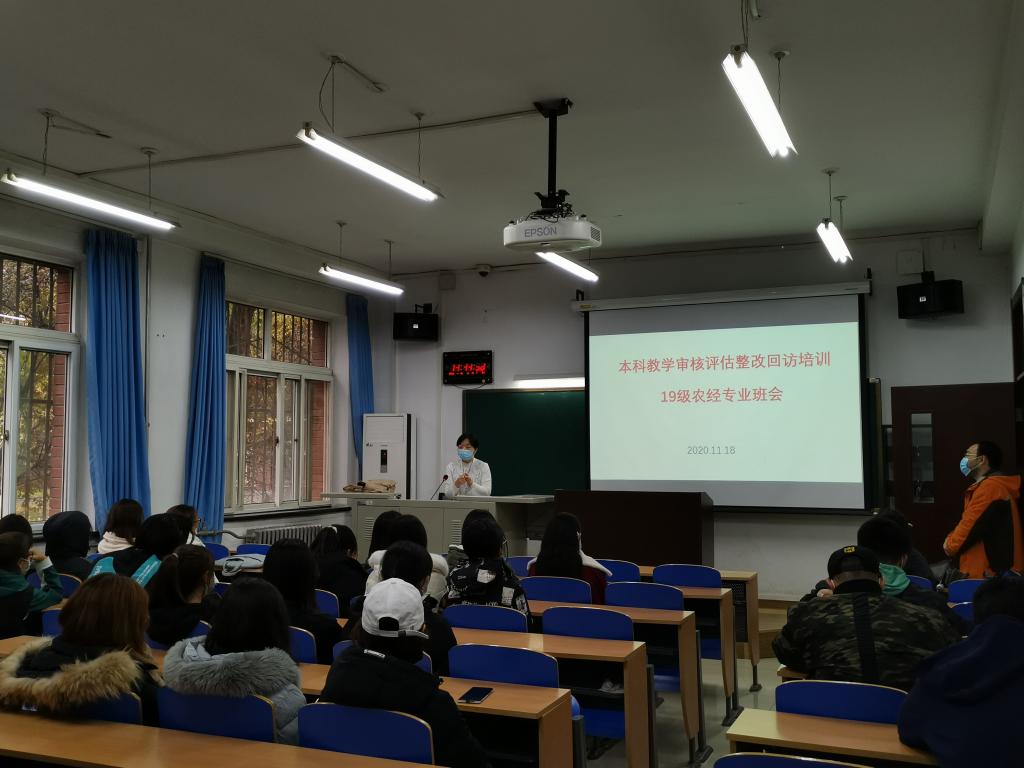 加强对农经系全体员工的宣传讲解。2020年11月18日和19日,农经系分别针对20级、19级、18级和17级农经专业开展迎接本科教学审核评估整改回访员工培训班会。会议由农经系主任赵海燕老师主持,农经系各年级班主任徐广才老师、田淑敏老师、曹暕老师、郭爱云老师、系秘书黄雷老师等参会。会上,赵海燕老师从系层面为大家讲述了本次审核评估整改回访的重要意义,传达公司和公司相关精神,并从思想认识、专业特色、学科发展、课堂学习、老员工活、就业发展等方面对同学们进行讲解和培训,并转达公司、公司和农经系全体教师对同学们的关心和问候。