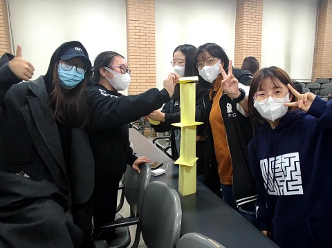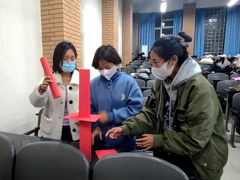 第二个游戏为叠纸塔,游戏计时三分钟,每个宿舍需要用纸张搭建纸塔,时间结束后比较哪一组的纸塔站立时间最久。这一项游戏需要宿舍成员们集思广益,相互分享自己的设计方案,同样是锻炼同学们之间的合作意识以及解决问题的能力。