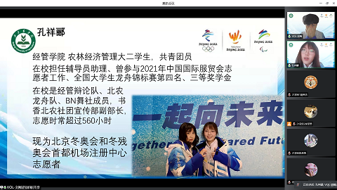 冬奥会、冬残奥会机场运行团队注册激活中心翻译岗的志愿者刘畅同学在参与的五场主题团日活动中,聚焦“实现价值”这一关键词,向同学们介绍了自己岗位所承担的工作内容以及一些令他印象深刻的工作、生活瞬间。刘畅表示,“虽然参与志愿服务期间经历了很多辛苦,但这个过程也是我们实现个人价值,为国家做贡献的过程,脸上被勒出的一道道印记和被防护服压扁的头发是志愿者们青春最美好的模样,也是最珍贵的回忆。”他鼓励同学们要心怀梦想,勇于担当,拼搏前行。