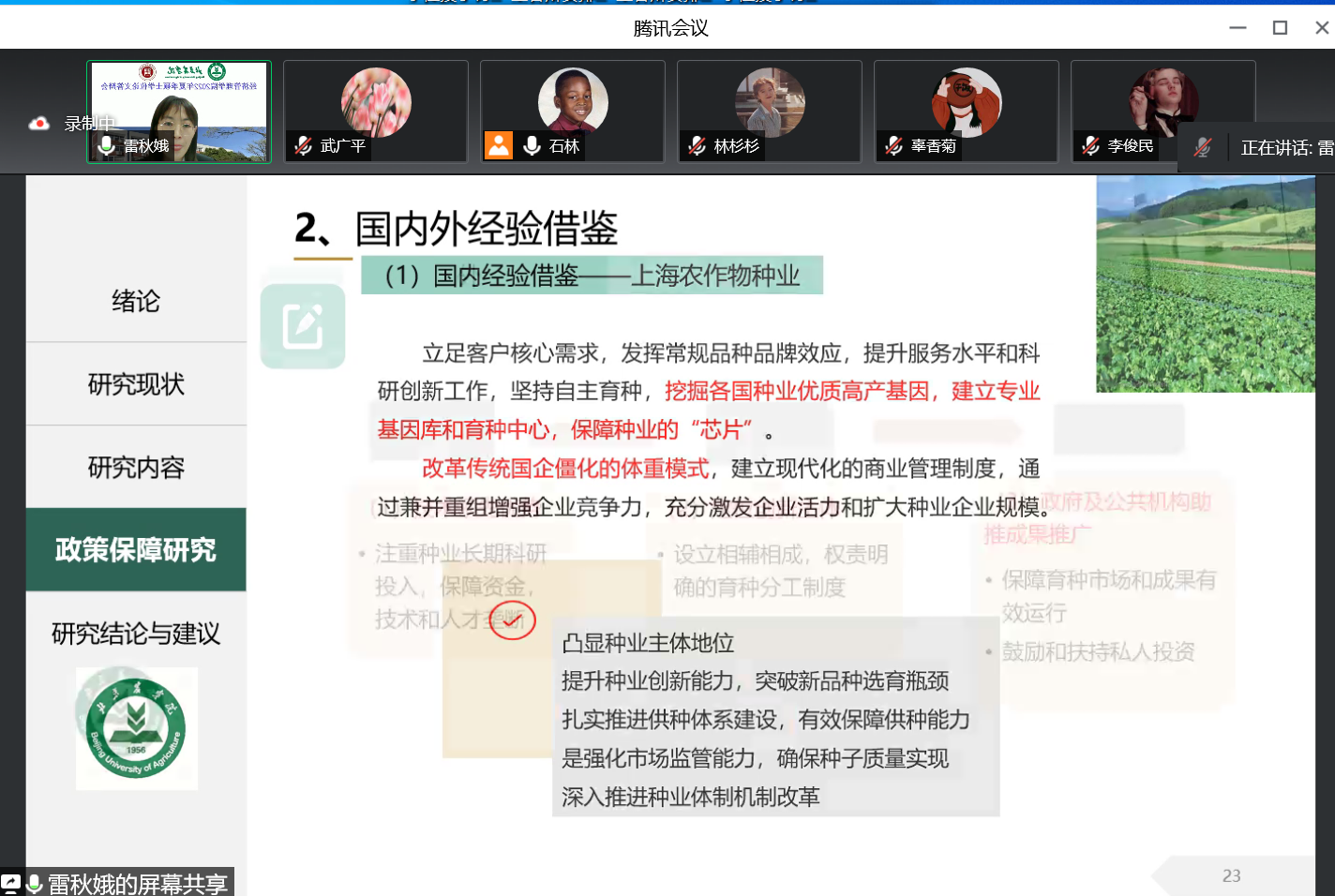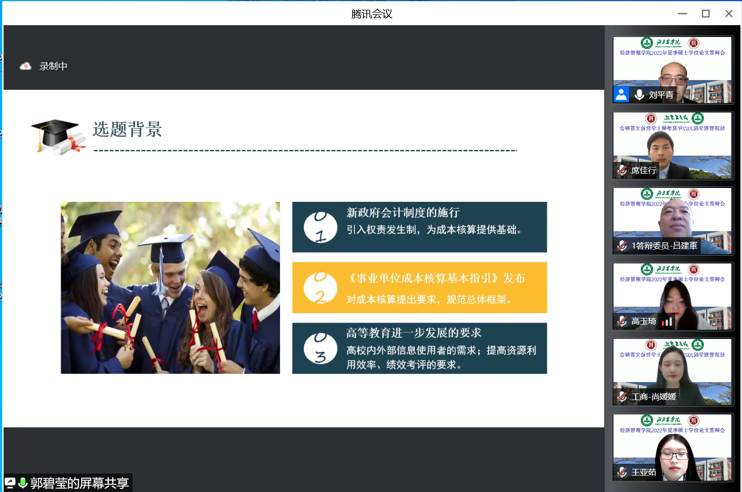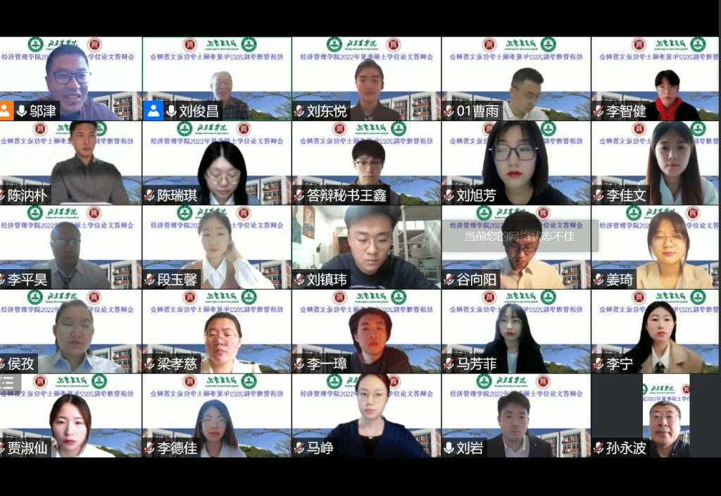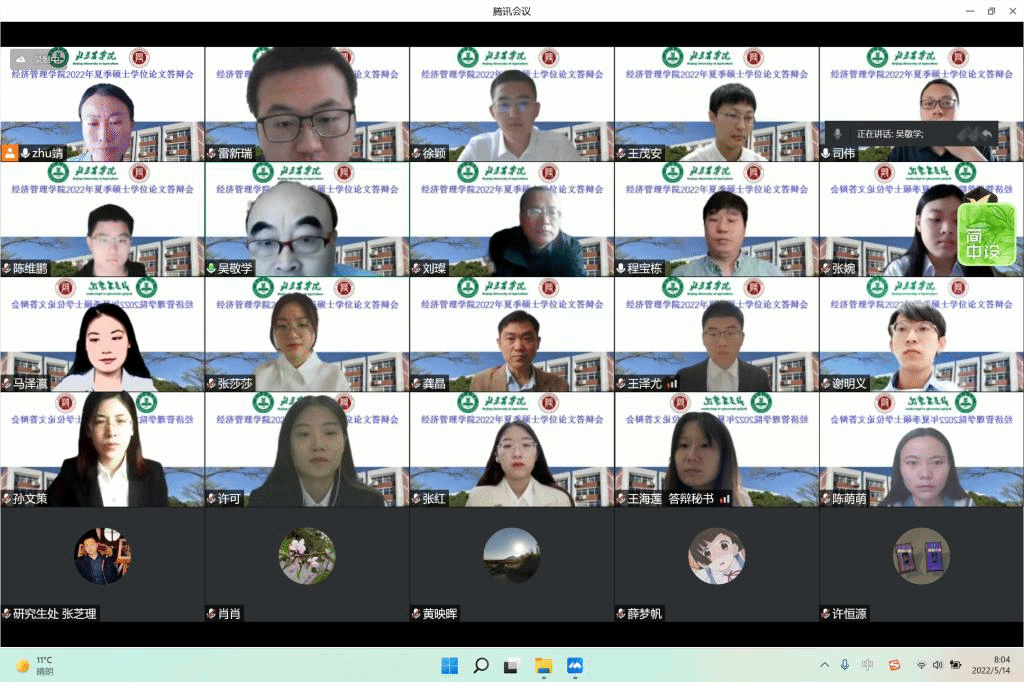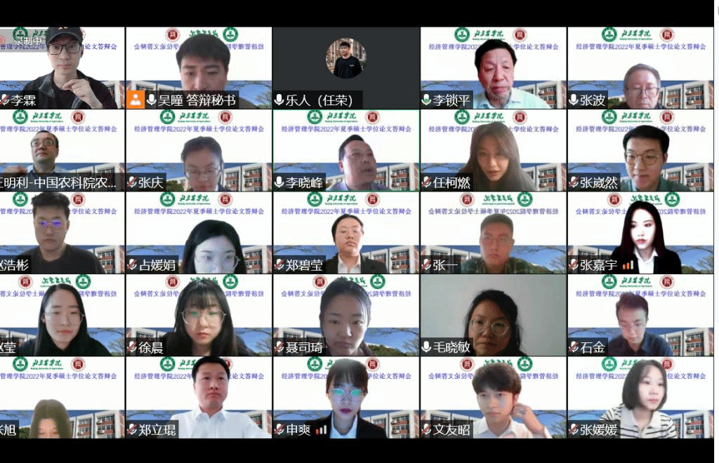 本次答辩采用腾讯会议平台分六个小组进行,参加答辩的有农林经济管理、工商管理两个学术学位和国际商务、农业管理两个专业学位的97名研究生。全部邀请校外专家担任评委,有来自中国社会科公司、中国农业科公司、中国农业大学、北京林业大学、北京工商大学等高校科研院所的专家,以及来自国家林业局、北京市农业农村局、北京市畜牧总站的行业专家30人。