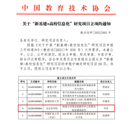 根据中国教育技术协会《关于“新基建+高校信息化”研究项目立项的通知》(教技协研[2022]002号),伟德BV官网刘芳教授的项目“高校文科类实验教学中心智慧实验室建设研究”获“新基建+高校信息化”重大项目立项。