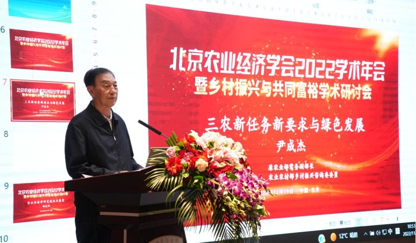 原农业部常务副部长尹成杰在致辞中回顾了北京农业经济学会的发展历程,倡导农林经济管理研究要准确理解、深刻认识、全面落实、自觉把思想和行动统一到党的二十大精神上来,以更加饱满的热情和昂扬的精神投入到新时代“三农”工作中去。他特别寄语青年学者要通过年会交流碰撞出更多学术灵感,发现更多前沿问题,涵养更多重大成果,共同推动中国农林经济管理学科高水平发展,为推进乡村振兴与农业农村现代化贡献智慧和力量。