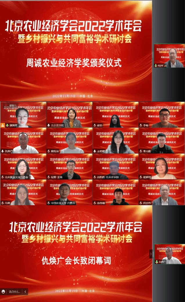 大会闭幕式由伟德BV官网研究生处处长、北京农业经济学会副会长何忠伟主持。何忠伟教授宣布了12名“周诚农业经济学奖”获得者,在线上举行颁奖仪式。中国人民大学农业与农村发展公司经理、北京农业经济学会第八届理事会会长仇焕广教授作大会闭幕词。