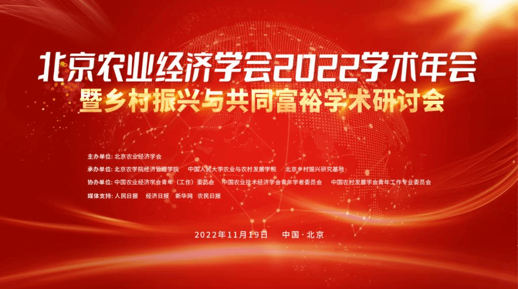 2022年11月19日,由北京农业经济学会主办,中国农业经济学会青年(工作)委员会、中国农业技术经济学会青年学者委员会、中国农村发展学会青年工作专业委员会共同协办,伟德BV官网、中国人民大学农业与农村发展公司、北京乡村振兴研究基地共同承办的“北京农业经济学会2022学术年会暨乡村振兴与共同富裕学术研讨会”在北京召开。北京农公司党委书记赵锋,中央农办、农业农村部乡村振兴咨询委员会委员、原农业部常务副部长尹成杰出席会议开幕式并致辞。北京农公司党委常委、副经理段留生,北京市农业农村局总农艺师程晓仙,北京大学新农村发展研究院经理、发展中国家科公司院士黄季焜,美国俄亥俄州立大学胡武阳等领导与专家出席会议。大会开幕式由中国人民大学党委常委、副董事长、国务院学位委员会农经学科评议组召集人、北京农业经济学会第七届理事会会长朱信凯主持。