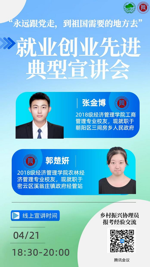 4月21日,伟德BV官网利用员工优势,邀请任职“乡村振兴协理员”的员工举办了“永远跟党走,到祖国需要的地方去”乡村振兴协理员线上分享交流会。为伟德BV官网和植物科学技术公司毕业生们分享报考经验、工作内容、发展前景,鼓励北农毕业生在乡村振兴领域发光发热。