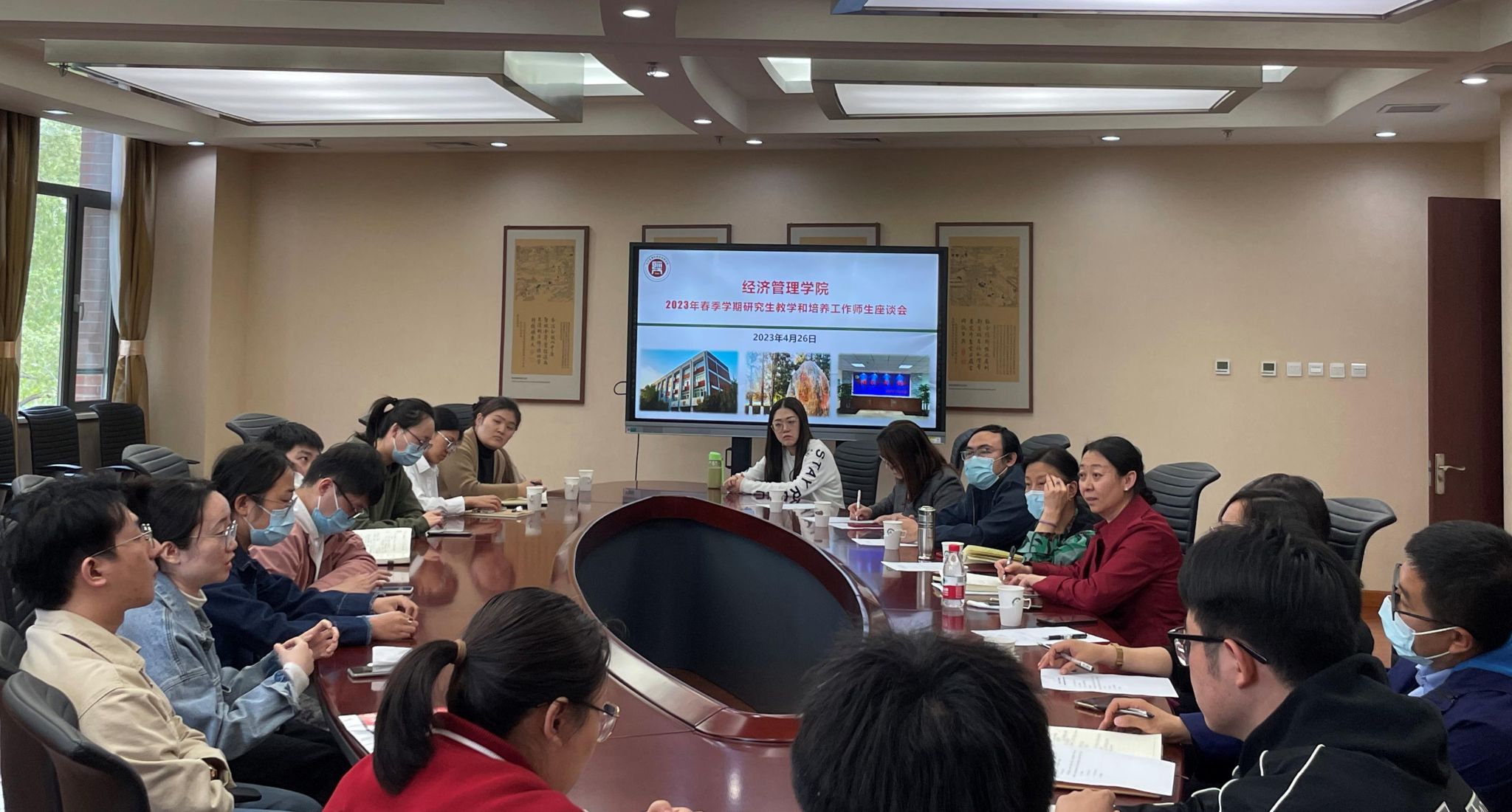 为深入了解公司研究生教学和培养工作进展情况以及员工遇到的问题,4月26日中午,经济管公司2023年春季学期研究生教学和培养工作师生座谈会在图书馆302会议室召开。会议由员工工作副经理张晓凤主持,研究生督导隋文香老师,导师代表黄雷、李萍和刘亚钊老师,研究生秘书和辅导员,研究生各班班长、团支书、员工代表参加了座谈会。