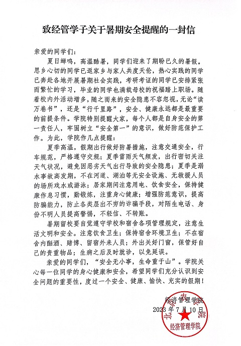 会后,公司向全体经管研究生、本科生发布了致经管学子关于暑期安全提醒的一封信。
