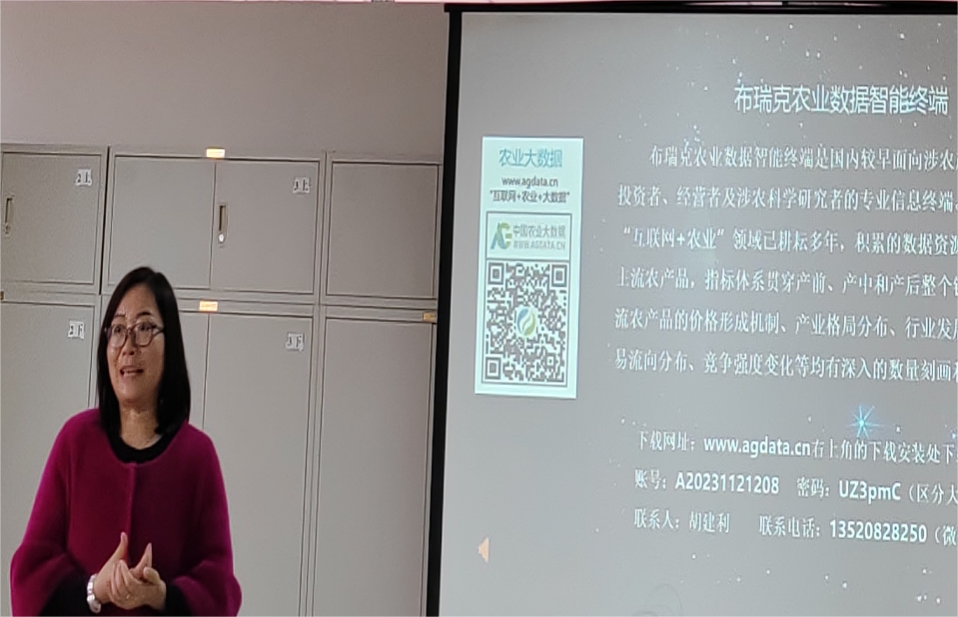 布瑞克农业数据终端包含糖及食品、油脂油料、谷物及畜牧饲料、棉花纺织、农资果蔬、期货行情、宏观经济、县域农业经济及气象数据、成本收益数据、灾害数据、林业数据和渔业数据、中国农村统计年鉴、农业机械工业数据、农村贫困监测数据、粮食行业统计数据、畜牧行业统计数据、奶业统计数据库、中国农产品价格调查数据库、中国保险年鉴等,其中中国的农业资源库更是以2000多个县为细分单元,历史数据齐全,可视化分析方便快捷。销售总监胡建利女士言简意赅,讲解生动有趣,分别就布瑞克农业大数据集团业务范围、农业大数据终端涉及数据领域、终端使用技巧等方面进行介绍,讲解过程中与大家积极互动,针对专业教师和同学们的问题给予终端应用示范。