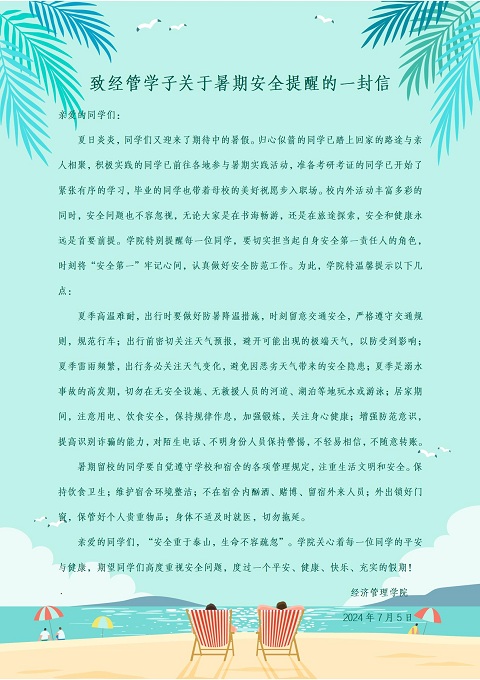 学工团队还深入宿舍强化安全教育,督促员工落实暑期离校前大扫除,排查安全隐患。组织暑期申请留宿员工签署了《安全承诺书》并建立暑期留宿员工台账。此外,学工团队还共同编写了《致经管学子关于暑期安全提醒的一封信》,将关怀传递给每一位员工。