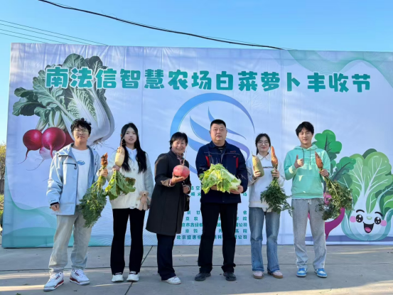 活动当天,南法信智慧农场内一片繁忙而喜悦的景象。同学们穿梭在白菜和萝卜田间,她们手持手机进行直播,向广大网友展示着丰收的喜悦和农产品的优良品质。在直播过程中,员工们详细介绍了白菜和萝卜的种植过程、营养价值以及食用方法。他们通过生动有趣的语言和互动环节,让观众们仿佛置身于丰收的田野之中,感受到了智慧农业的独特魅力。
