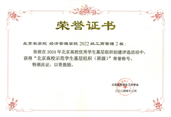 在2024年12月北京高校员工工作学会组织开展的“2024年北京高校优秀员工基层组织创建评选活动”中,22工商2班荣获“北京高校示范员工基层组织(班级)”荣誉称号。