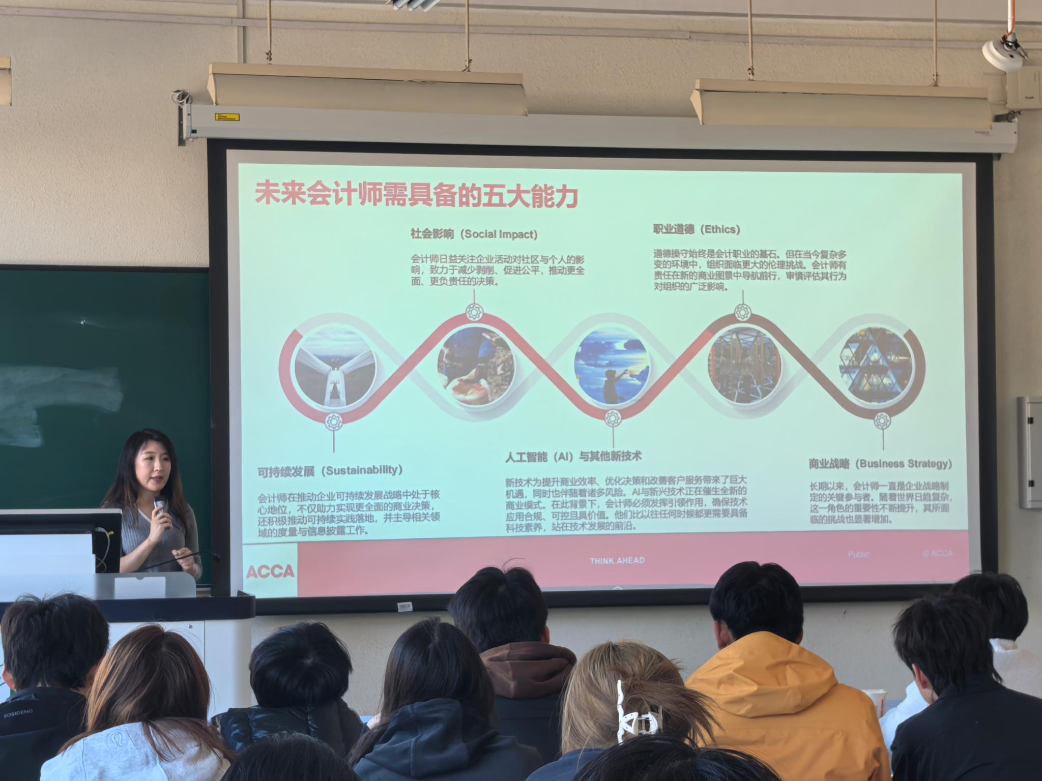 范玉涵首先解读了未来会计师必须具备的五大核心能力——社会影响、可持续发展、职业道德、人工智能与其他新技术,以及商业战略,为同学们指明了能力提升的方向。范玉涵重点介绍了2026年春季ACCA全国就业力X未来商业创想大赛(JHC)相关信息,包括创新与亮点、参赛优势、赛事流程、时间节点等。她鼓励同学们“迈出第一步,有开始才有结果”。