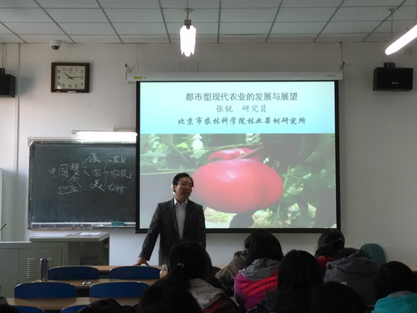 2014年10月27日北京市农林科公司林业果树研究所副所长张锐教授应伟德BV官网农经系陈娆老师邀请进入课堂,给同学们做了一场丰富多彩的《都市型现代农业的发展与展望》报告。