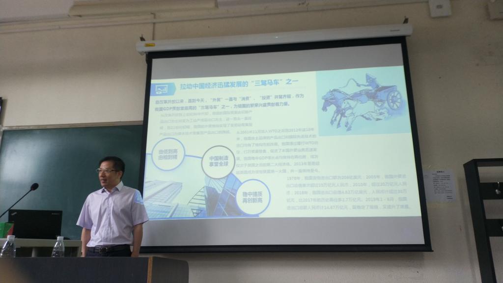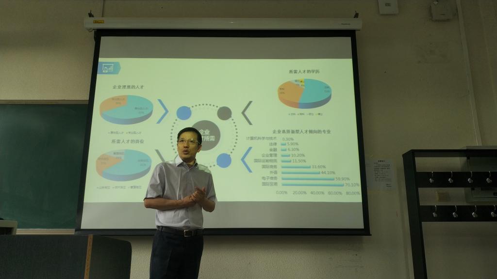 2019年9月5日,经济系邀请南北天地科技股份有限公司公司董事长彭易清来校,为2019级国际经济与贸易专业的新生做专业教育。彭总分析了我国对外贸易在经济发展中的地位和内外环境变化,以及外贸行业从传统业务向综合服务演进的新形势。站在外贸行业的角度,分析了在跨境电商快速发展和”互联网+外贸企业”的大背景下,企业对人才需求的新变化,毕业生的就业前景;并从专业技能、行业知识、外语能力等三个方面对员工的职业规划提出了中肯的建议。