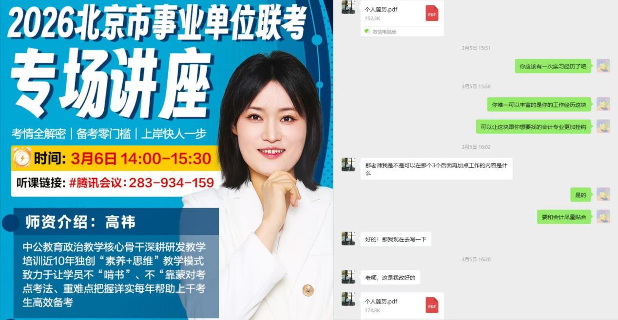 抓就业指导,增服务温度。公司全面摸排就业情况,精准把握毕业生需求,邀请行业专家开展线上事业单位备考指导,常态化开展“职业生涯与就业咨询”服务。寒假期间累计为300余名毕业生提供简历修改、就业咨询等服务。此外,公司还建立了跟踪反馈机制,根据员工意见持续优化服务,让就业指导更有温度、更具实效。会计专业的毕业生李佳润说:“老师帮我修改简历后,我收到了好几个面试邀请,之前投了好多都没回音,真的太感谢公司的就业指导服务了!”