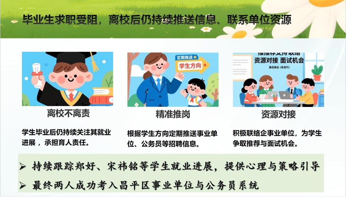 2023届本科生郑好、2024届专硕生宋祎铭,离校时工作尚未落定。李萍没有停止关注,持续为他们推送招聘信息,主动联系单位推荐,一次次在电话里听他们讲述求职的进展与困惑。今年,两人先后考入昌平区事业单位和公务员系统。宋祎铭报到后发来消息:“老师,谢谢您一直没放弃我。”