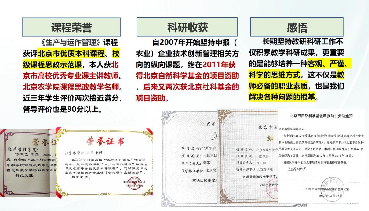 科研路上,她也走得执着。自2007年开始一直坚持科研方向的探索与项目申报,获得北京自然科学基金项目资助和两次北京社科基金项目的资助。她说,科研训练带给她的不仅是成果,更是一种“客观、严谨、科学的思维方式”,这是教师职业的底色,也是引导员工走向理性的根基。