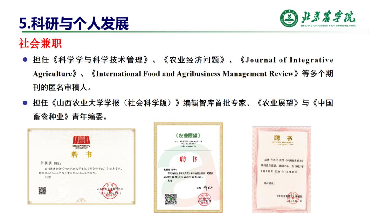 同时,张强强老师取得了丰硕的科研成果,主持北京市教育科学“十四五”规划青年专项课题等3项省校级项目,发表SCI、CSSCI论文6篇,出版15.8万字学术著作《中国苹果生产布局演变与优势评价研究》;在社会服务中,他担任《科学学与科学技术管理》等权威期刊匿名审稿人、《山西农业大学学报(社会科学版)》编辑智库专家等职,以专业影响力搭建学术资源网络。