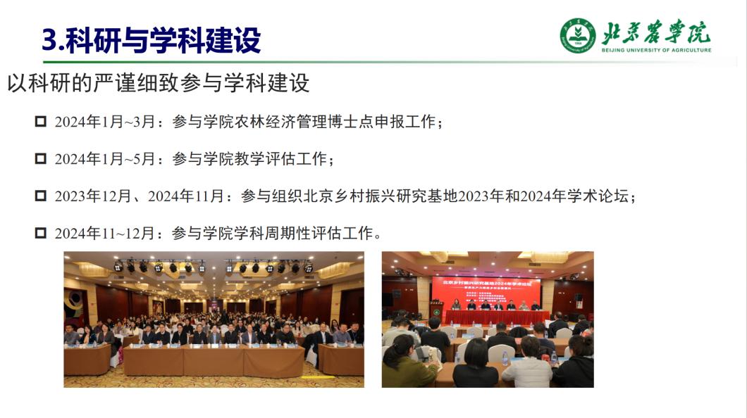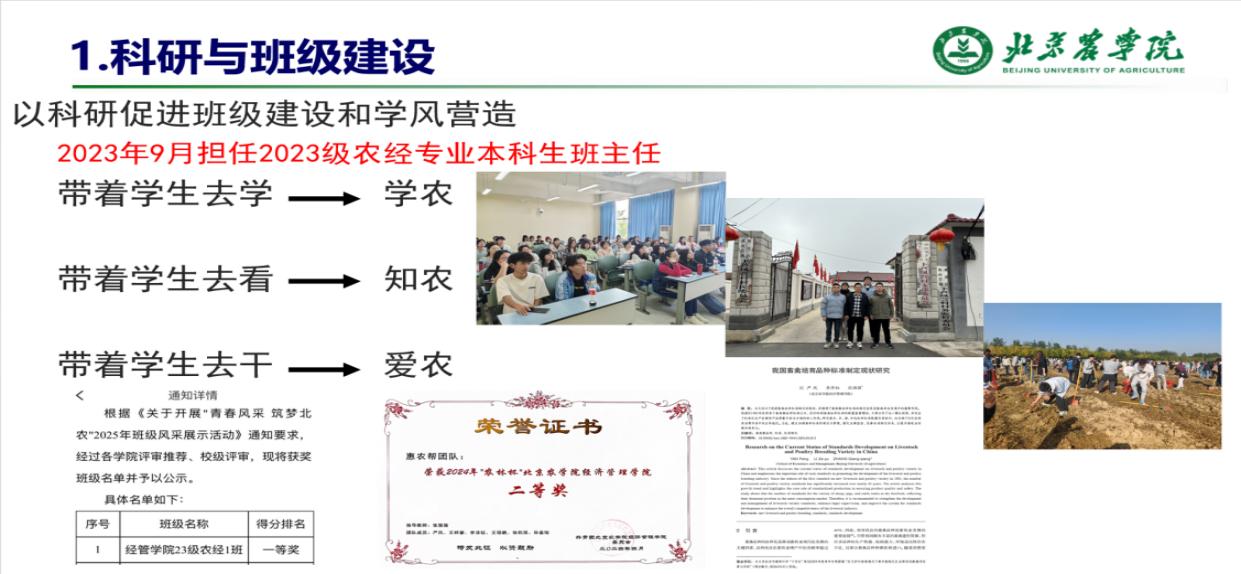展望未来,张强强老师将继续以科研为支点,深化“学农、知农、爱农”育人路径,带领员工深耕乡村振兴领域,用专业学识与科研能力书写“强农兴农”的青春答卷。他期待与员工一道,在首都农业现代化与乡村全面振兴的征程中,以科研精度与育人温度,共同描绘北农人“懂农业、爱农村、爱农民”的动人图景。
